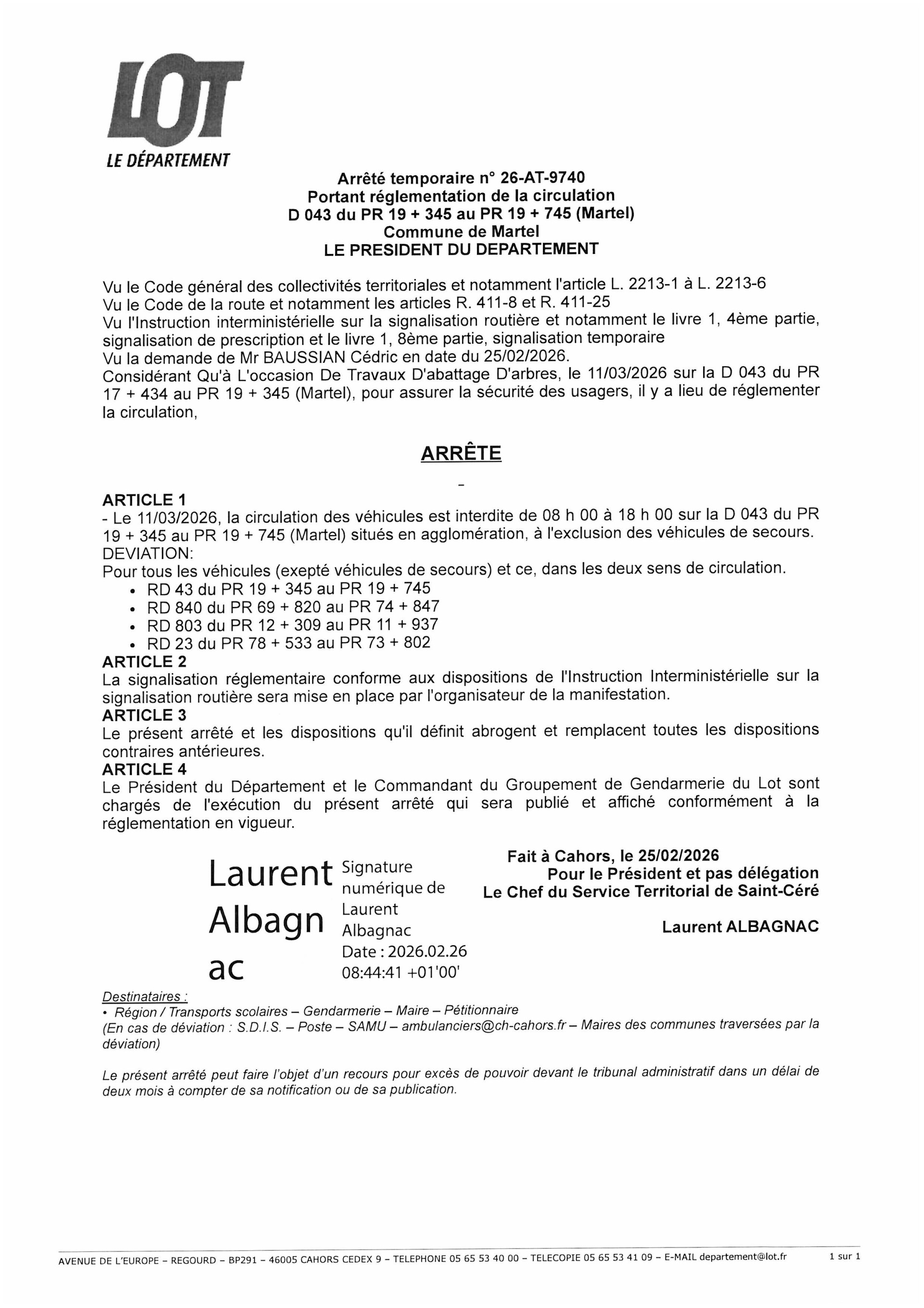 Arrêté de circulation RD 43